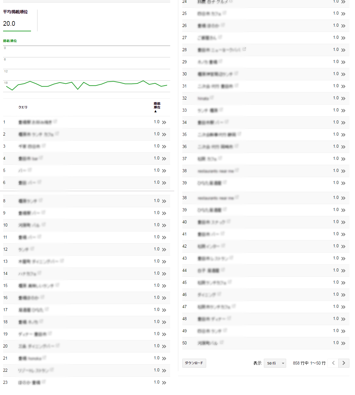 上記の画像はとあるクライアント様のホームページがどんな検索ワードで何位に表示されるか、と言うものを表示したものです。検索ワードはクライアント様の情報に関わるのでボカシがかかっていますが、1ページに表示される検索ワードがすべて1位です。