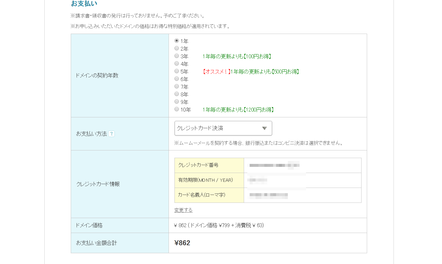 先程1年の支払は税込¥862だったのに2年目に変更すると税込¥5161というシステムバグを疑うような数字に変貌しました。これはバグでもエラーでもなく、2年目からは4000円くらいしますよ、ということです。